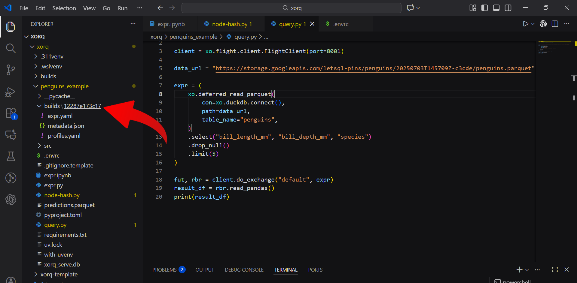 xorq run builds/$env:BUILD_HASH -o predictions.parquetRuns the pipeline and saves results to predictions.parquet.