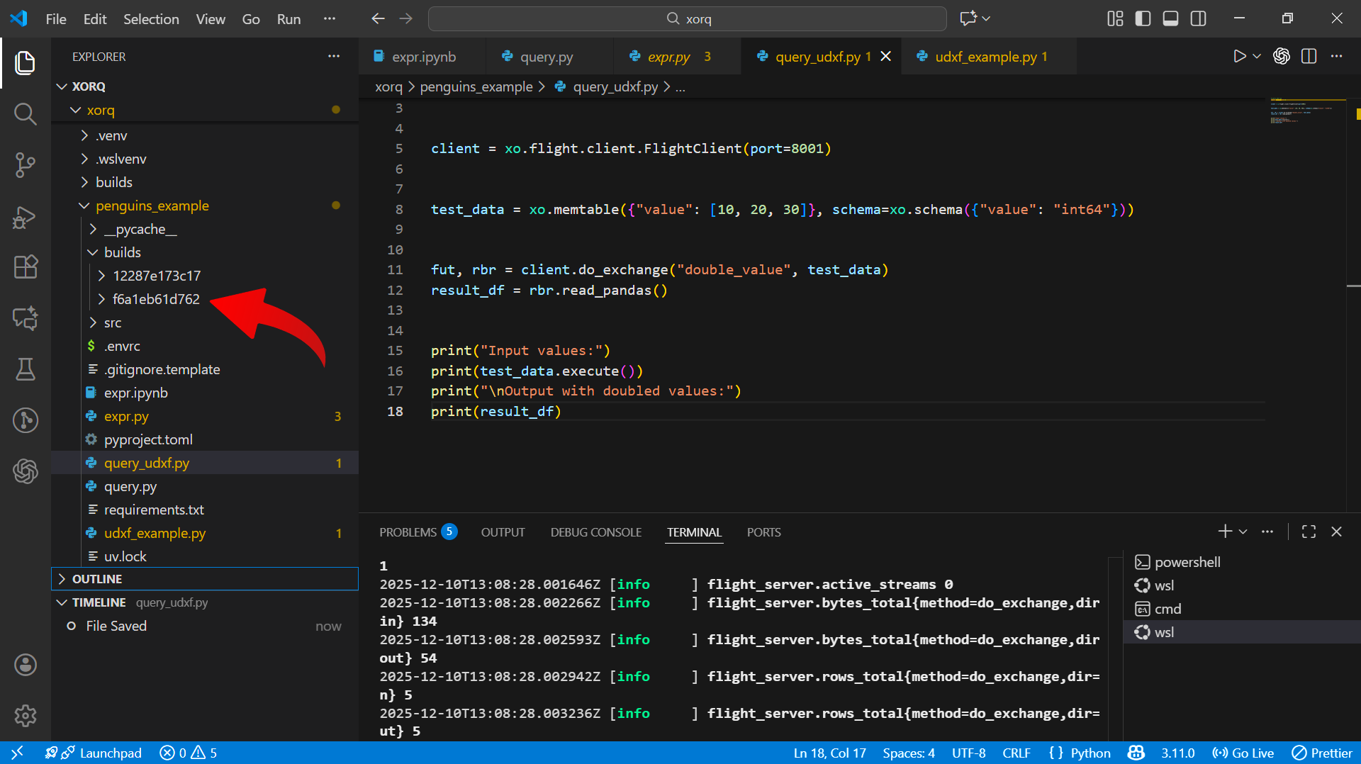 xorq serve-flight-udxf --port 8001 builds/<BUILD_HASH>Your UDXF is now running as an endpoint on localhost:8001. Keep this terminal window open while you query it.